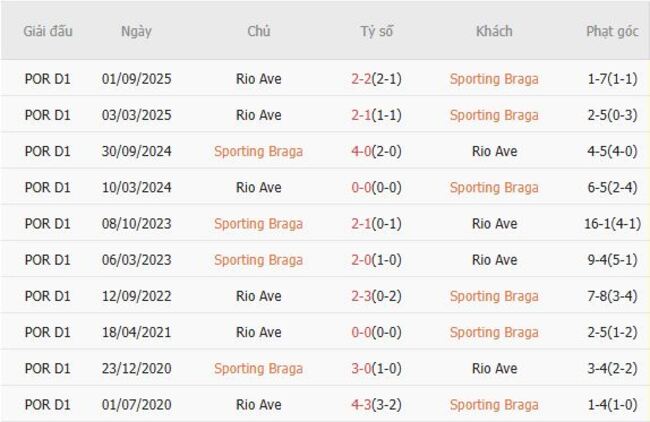 Thành tích đối đầu quá khứ giữa Braga vs Rio Ave
