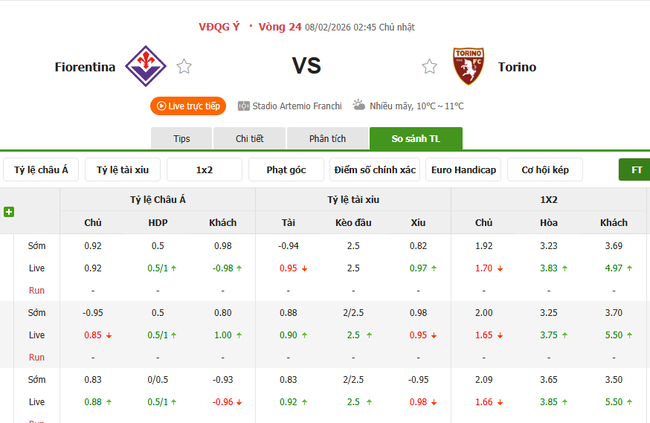 Tỷ lệ kèo Fiorentina vs Torino
