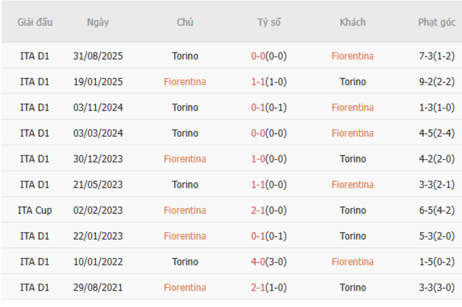 Thành tích đối đầu quá khứ giữa Fiorentina vs Torino