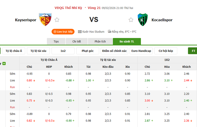 Trên đây là những nhận định và soi kèo bóng đá chuyên sâu cho màn thư hùng giữa Kayserispor vs Kocaelispor, 21h00 ngày 09/02/2026.