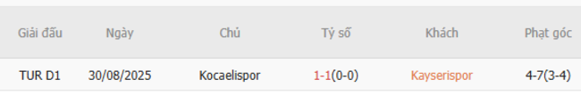 - Kết quả chung cuộc: Kayserispor 1-2 Kocaelispor