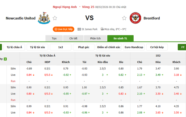 Tỷ lệ kèo Newcastle vs Brentford