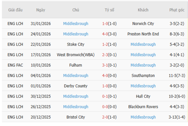 Phong độ của Middlesbrough