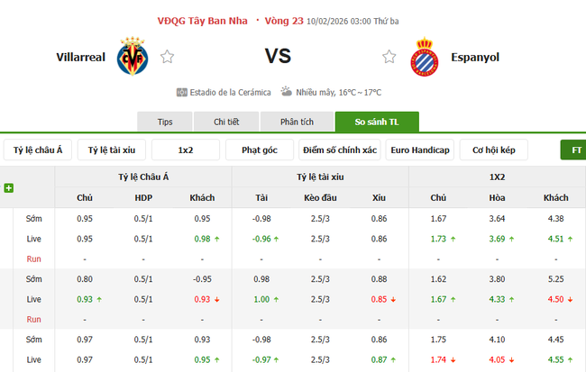 Tỷ lệ kèo Villarreal vs Espanyol
