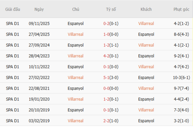 Thành tích đối đầu quá khứ giữa Villarreal vs Espanyol