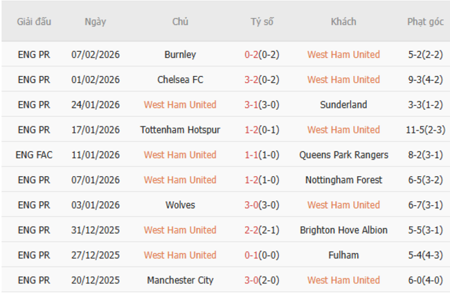 Phong độ của West Ham