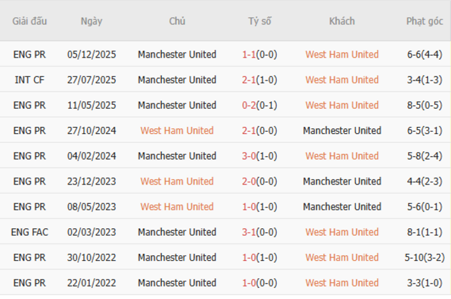 Phong độ gần đây - West Ham vs Man United